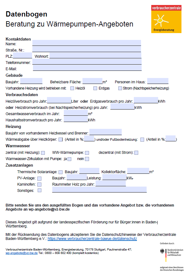 Als Haushalt aus Baden-Württemberg füllen Sie einfach unseren Erfassungsbogen aus. Dann senden Sie den ausgefüllten Erfassungsbogen zusammen mit Ihren bereits vorliegenden Angeboten (max. 3 Angebote) per E-Mail an wp-angebote@vz-bw.de.