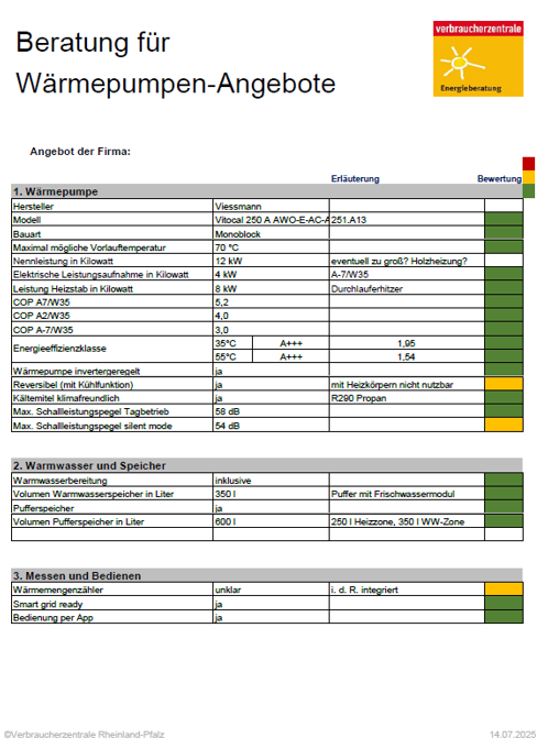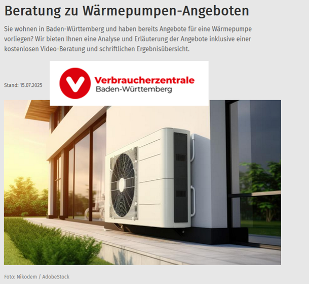 Voraussetzung: Sie wohnen in Baden-Württemberg und haben bereits Angebote für einen Heizungstausch mit Wärmepumpe vorliegen. Die Verbraucherzentrale Baden-Württemberg bietet Ihnen eine Analyse und Erläuterung der Angebote inklusive einer kostenlosen Video-Beratung und schriftlichen Ergebnisübersicht.