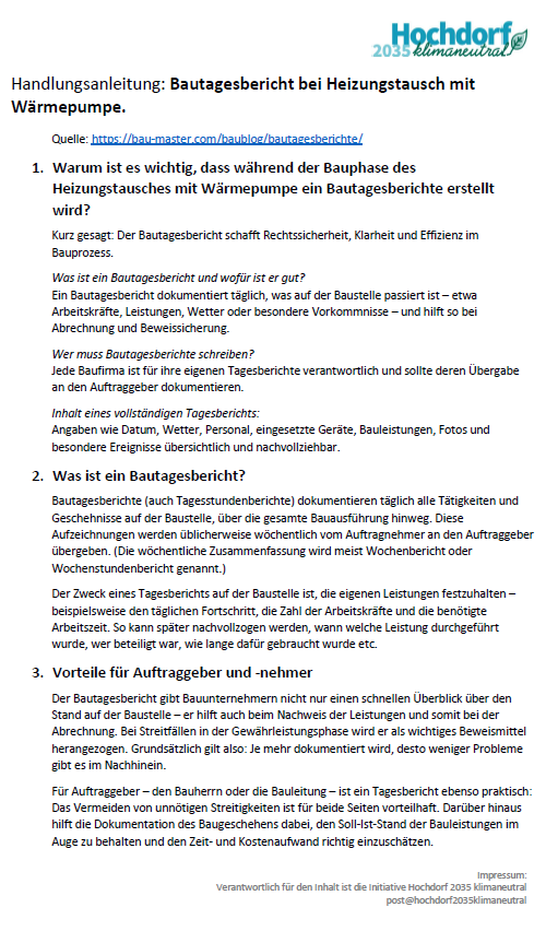 Die Unterlagen Handlungsanleitung: „Bautagesbericht bei Heizungstausch mit Wärmepumpe.“ Beschreibt Zweck, Inhalt und Verantwortlichkeiten bei der Erstellung des Bautagesberichtes.