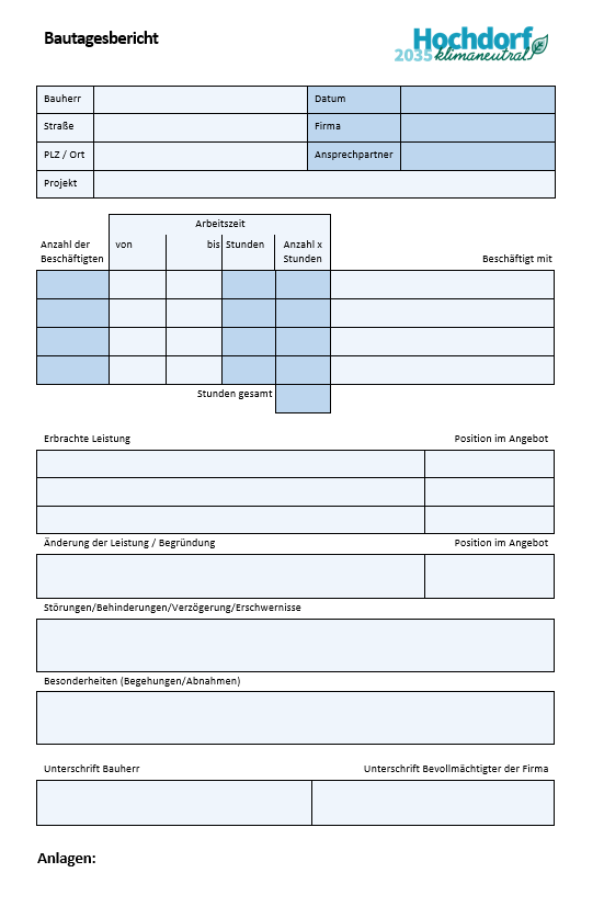 Der Lieferant ist verpflichtet einen strukturierten Bautagesbericht zu erstellen.