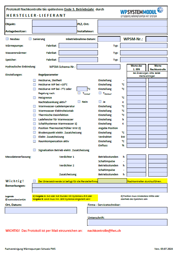 Beispiel: „Nachkontrolleprotokoll“ für den Lieferanten bei der Zertifizierung „WPSystemModul“ in der Schweiz.